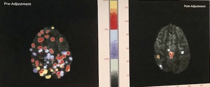 This image suggests large-scale stress reduction and efciency gains in the brain following a single chiropractic adjustment. Pre-chiropractic image on left shows highly inefcient brain activity required to achieve a simple task challenge. Post-chiropractic on right image depicts greatly reduced brain “noise” associated with the same level of stress challenge. Case Studies in Chiropractic MRI, Kent C., Vernon L., International Chiropractic Association, 1998.1